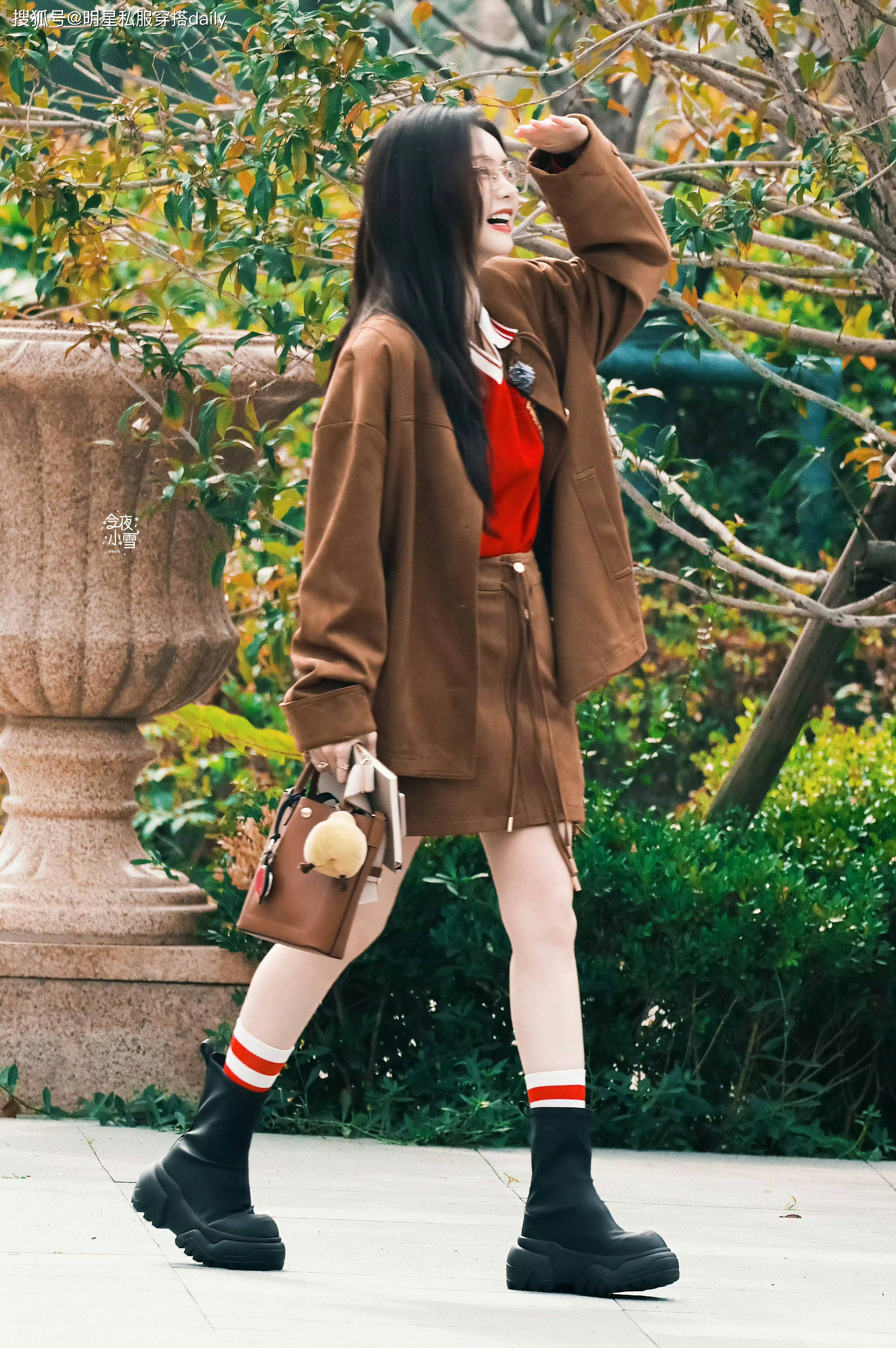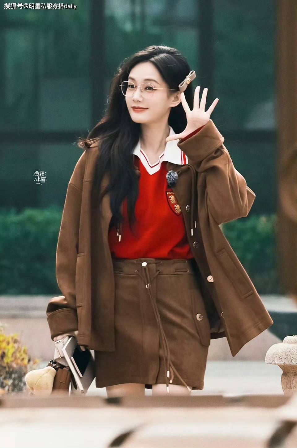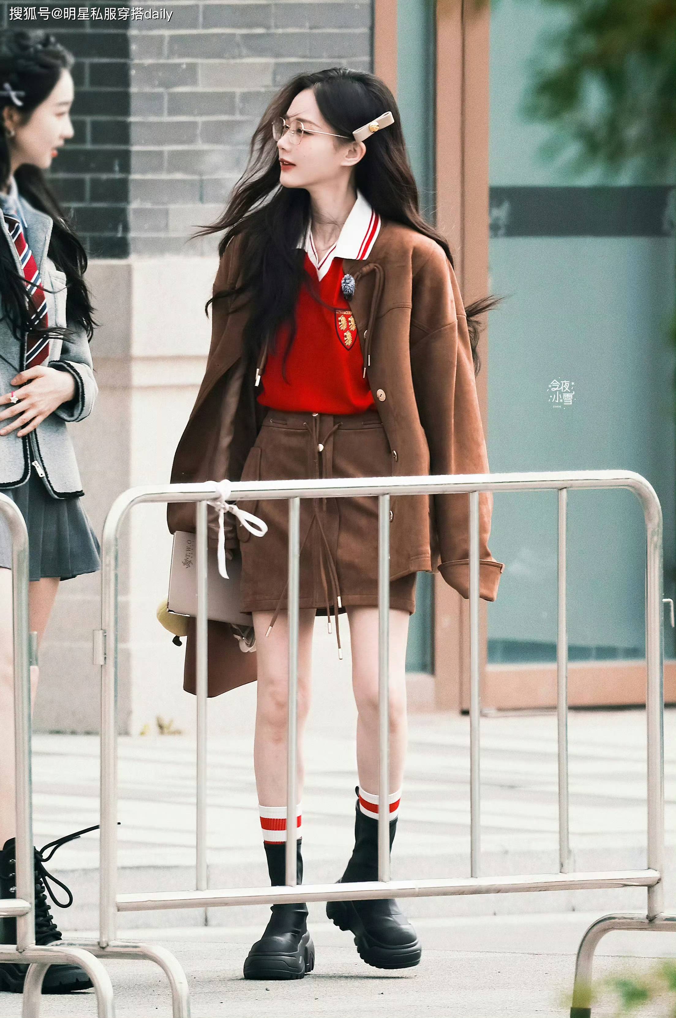 在配饰方面,李一桐选择了头戴蝴蝶结发夹,佩戴金属边框眼镜,这样的搭配不仅让她的甜美气质得到了进一步的凸显,更增添了几分俏皮与可爱。手拎的棕色水桶包,与整体穿搭的色彩相呼应,既实用又时尚。整体来看,李一桐的这组“红棕配色”穿搭,既展现了她的甜美气质,又彰显了她的时尚品味。