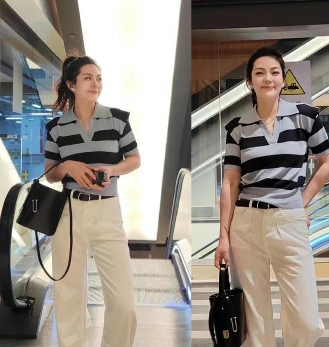 上图这件条纹POLO衫,就是更具中性气质的服装款式,而与米白色阔腿裤的搭配中,还加入了一条黑色皮带,装饰出了几分帅气格调。