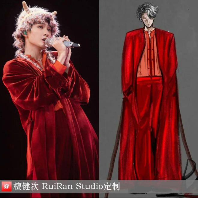 檀健次,2024「多见一次」个人巡回演唱会深圳站。红色丝绒大衣:RuiRan Studio定制。