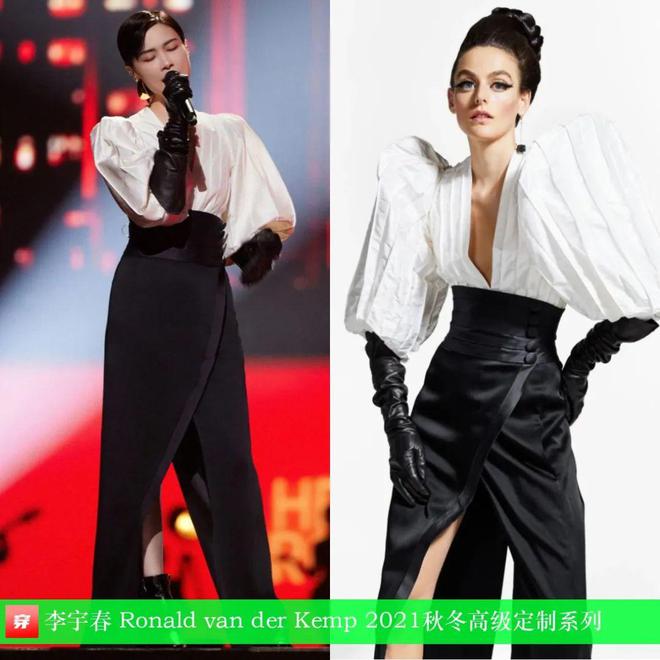 李宇春,《声生不息·港乐季2》。白色深V泡泡袖衬衣、黑色前开叉半身裙:Ronald van der Kemp 2021秋冬高级定制系列。