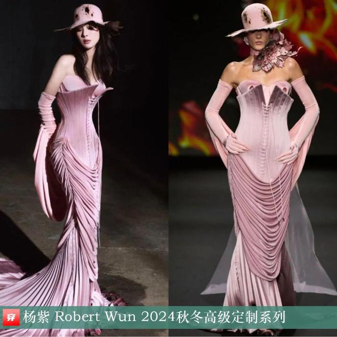 杨紫,工作室发生日照。渐变粉色拼接抹胸礼服:Robert Wun 2024秋冬高级定制系列。