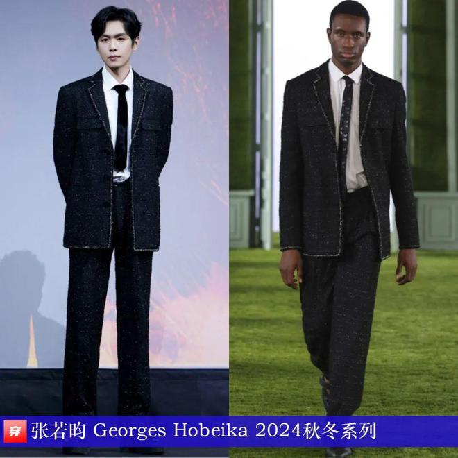 张若昀,电影《狮子王:木法沙传奇》首映礼。亮钻饰边黑色粗花呢套装:Georges Hobeika 2024秋冬系列。