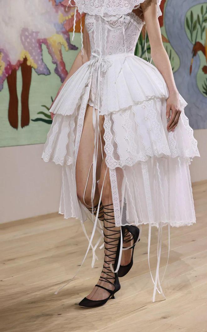 经现代实用主义改良的衬裙化作记忆的绝佳载体,承载着天马行空的幻想与图案。摇曳的裙撑隐匿于廓形之下,跟随每次律动浮现伸展起伏的线条,宛若以刺绣点缀的枝条。勾勒轮廓的结构隐而不显,令缀饰花朵刺绣的衬衫更添轻盈质感。