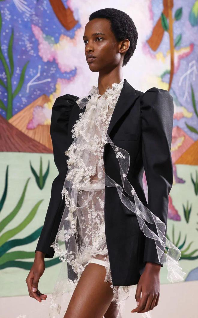 在此种交织对比之中,她可以宛如盛放的花朵,身披花瓣斗篷,或身着花冠造型的短款礼服,尽显曼妙曲线;她亦可化身翩跹的飞鸟,搭配头饰,率性演绎朋克风格。