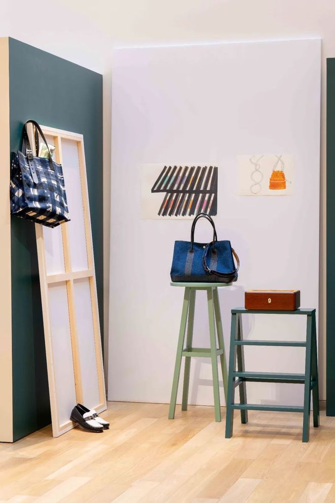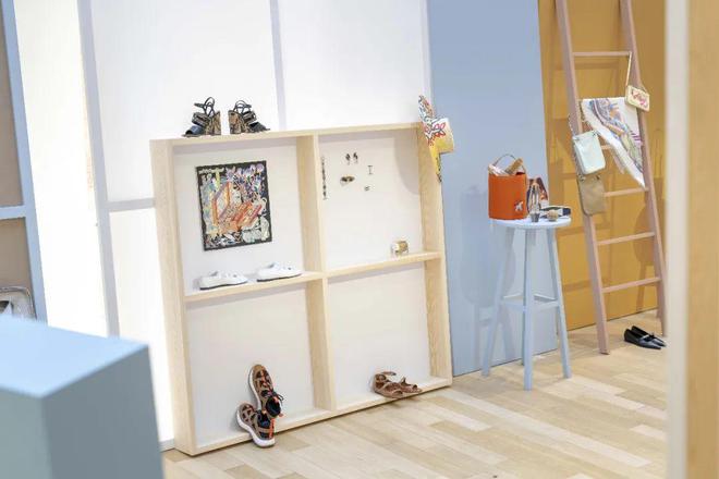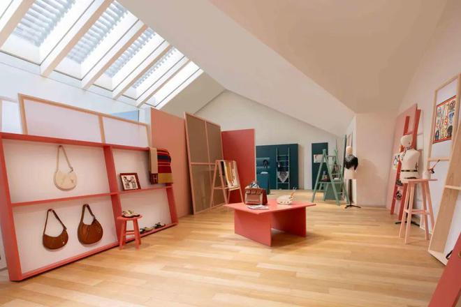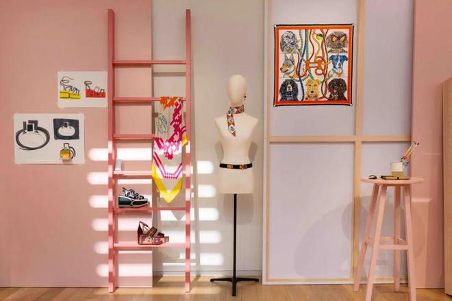粉色空间,作为画室创意迸发的灵感之所,细腻展陈精心打造的全新作品,Petit Tour 41 小牛皮手袋、Kiga钩织面料配皮革运动鞋、Oud Alezan爱马仕闻香珍藏系列乌木灵犀香型香水和“跳跃,爱马仕”(Saut Hermès)羊绒配真丝男士菱形巾成为粉色之境的主角,于优雅的氛围中,交织出绮丽的匠艺世界。