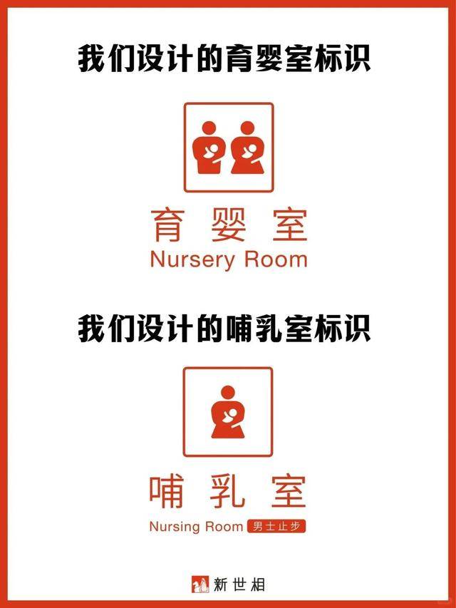 新世相将育婴室与哺乳室分开,育婴室对爸爸开放,Logo也设计成了父母双方共同抚育的画面,而哺乳室则标注着「男士止步」,为妈妈们提供一个私密安全的哺乳空间。